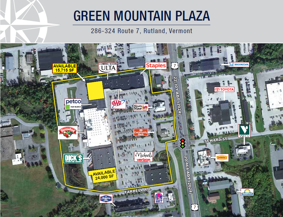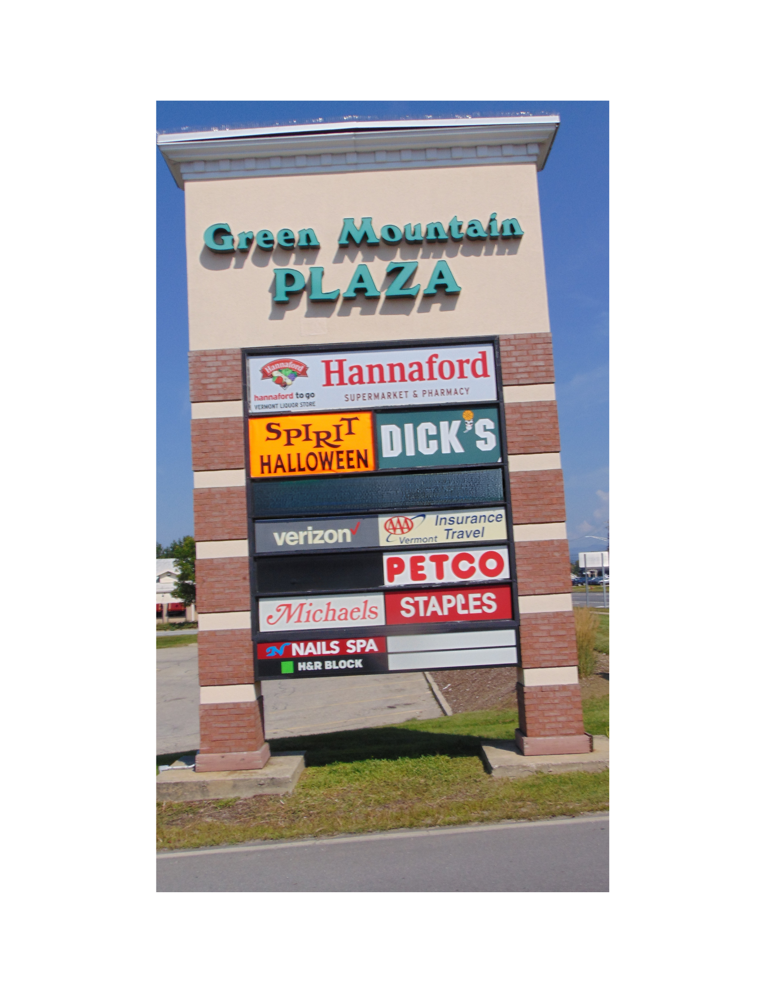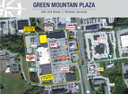On high-profile State Route 7 near the intersection with State Route 4, Green Mountain Plaza is a 187,000-square-foot multi-use shopping center in Rutland, Vermont's third largest city. In the thick of a regional trade area in the Green Mountains, the 21-acre plaza features a mix of nationally recognized retailers, including Hannaford, Dick’s Sporting Goods, Michael’s, Staples, and Petco. More than 23,000 vehicles travel along Route 7 daily; 50,000 consumers live within a 15-mile radius of the center.