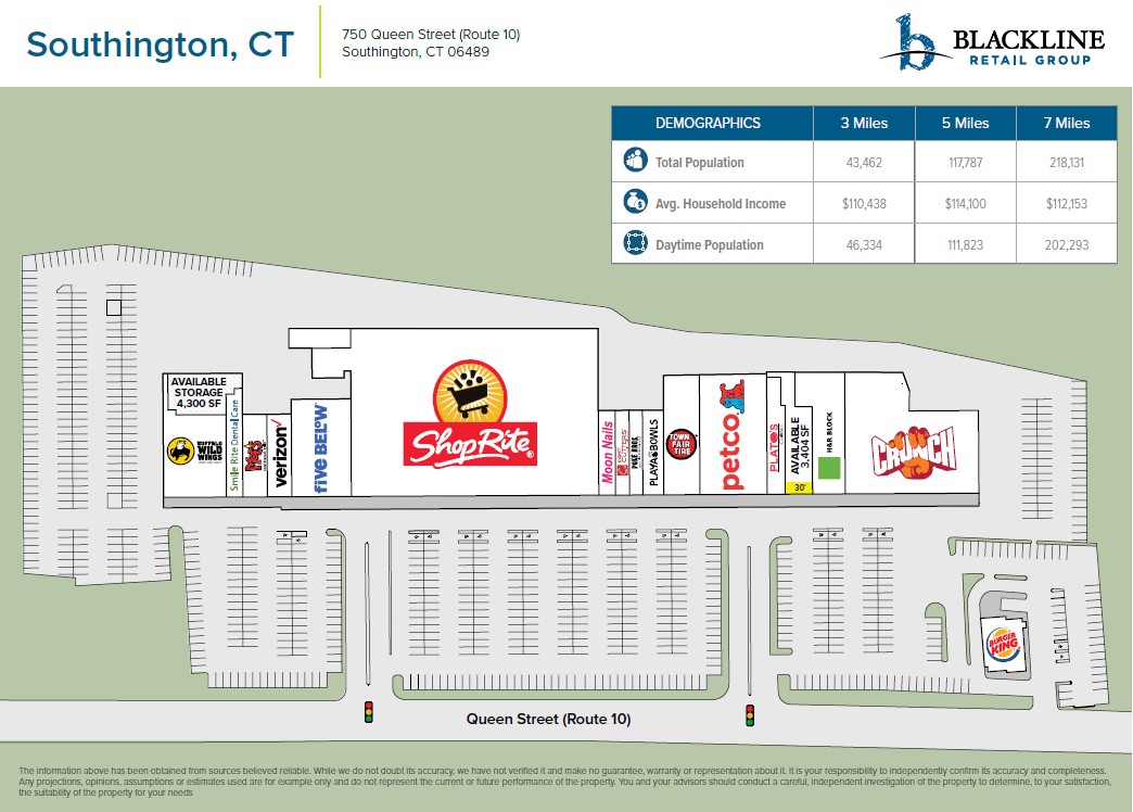 Shop Rite Plaza is located in Southington, Connecticut, on Queen Street/Route 10, a highly traveled retail corridor lined with independent and chain restaurants, big box stores and family-owned businesses. The plaza is anchored by Shop Rite, Petco and Buffalo Wild Wings, and has two signalized entrances and ample parking.